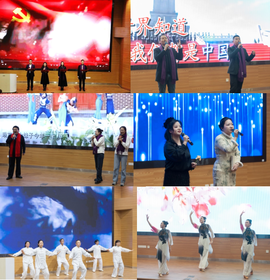表彰中,穿插了学院分工会精心组织编排的文艺表演。深情的诗朗颂《可爱的中国》、少数民族风情浓郁的土家民歌《六口茶》、充满故事且超越时间的女声二重唱《岁月》、满怀自豪与自信的男声二重唱《中国人》、康体养生的健身气功《八段锦》、美丽优雅的舞蹈《王招君》,既展现出学院职工多才多艺的风貌,也为大会增添了跨年氛围。