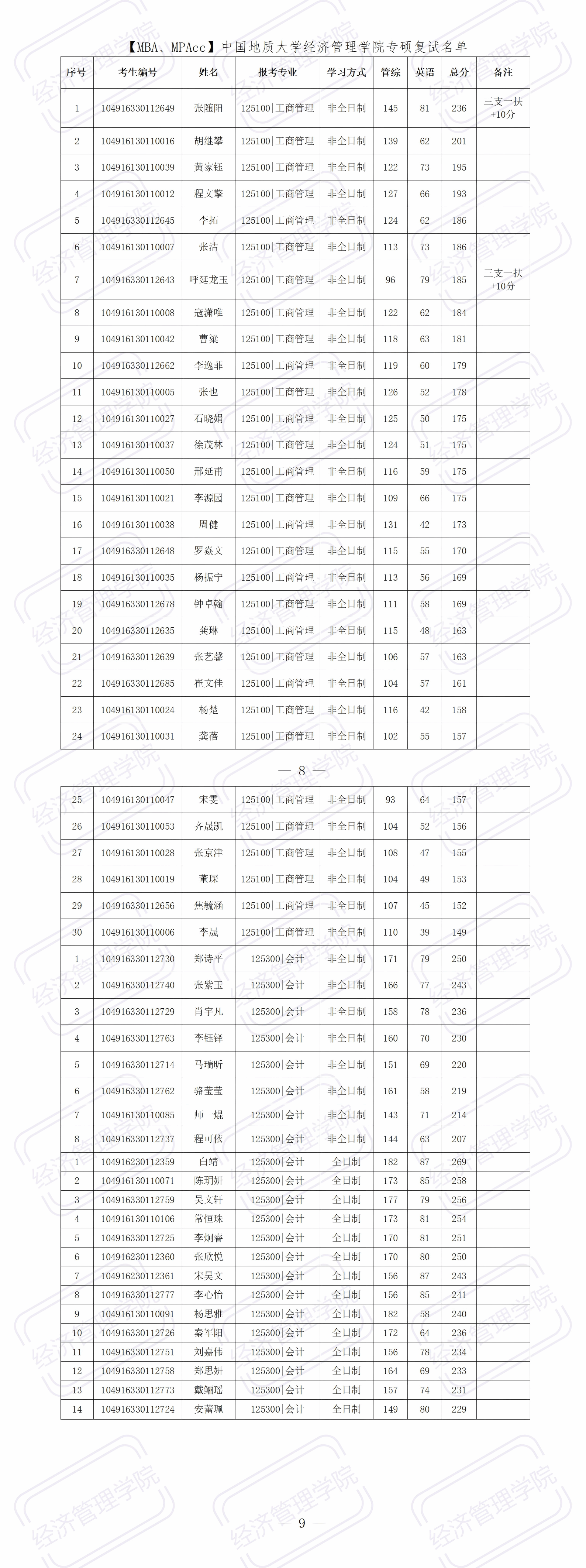 一、【MBA、MPAcc】中国地质大学kaiyun开云官方网站专硕复试名单