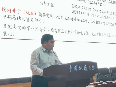 最后,蔡杨讲授院本文化及感恩诚信教育。蔡杨以征信知识为引,教育全体毕业生党员要以诚信为魂,廉洁为根,并深刻阐述了校训精神和学院文化,愿开云官网毕业生党员牢记教诲,终身不褪“地大经管色”,成长为德智体美劳全面发展的社会主义事业建设者和接班人!