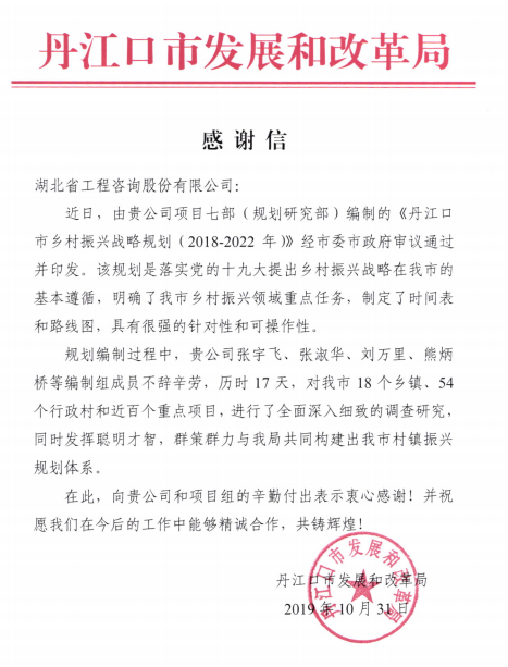 丹江口市发展和改革局向刘万里校友单位发送感谢信