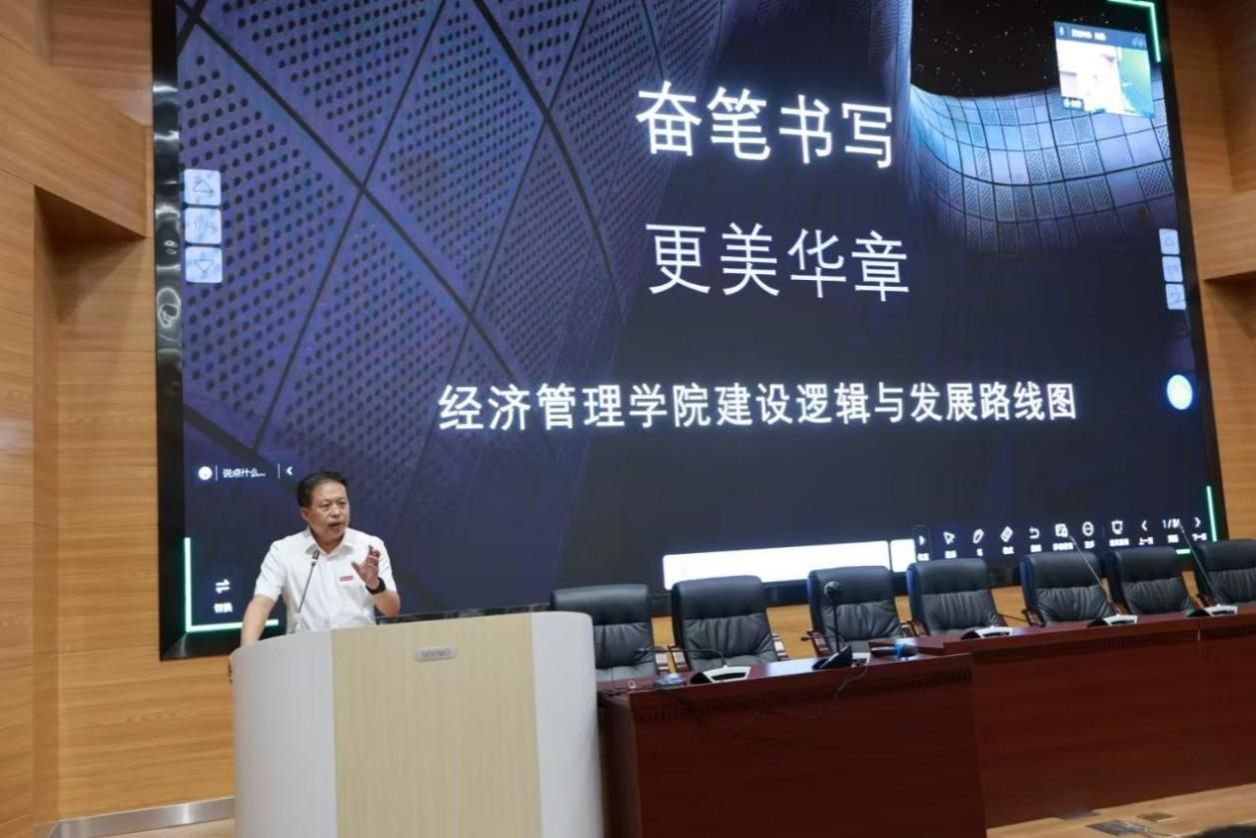 院长於世为首先对加入经管大家庭的研究生们表示祝贺和欢迎,随后从学科建设、专业设置、人才培养等方面介绍了学院概况,并对新生提出了两点期望,一是要担当使命,探索经济管理新规律,二是要面向未来,培养综合素质能力。