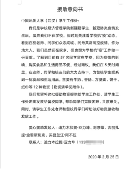 2020年2月26日,中国地质大学(武汉)全体留在学校的同学们心里多了几分温暖,可爱的笑容隐藏在口罩里若隐若现,眼眶打转的泪水流露着感恩之情。原来,正是在疫情期间物资紧缺的时候,同学们领取到了一批来自天山学子们援助的特别礼物——食品和生活用品,一解大家燃眉之急。