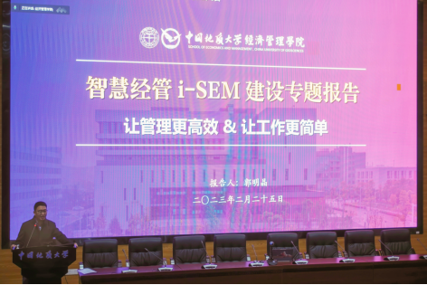 郭明晶院务委员作“智慧经管”建设与使用报告。他从建设目标、建设思路、功能设计、预期效果对i-SEM“智慧经管”信息系统建设情况做了专题介绍。